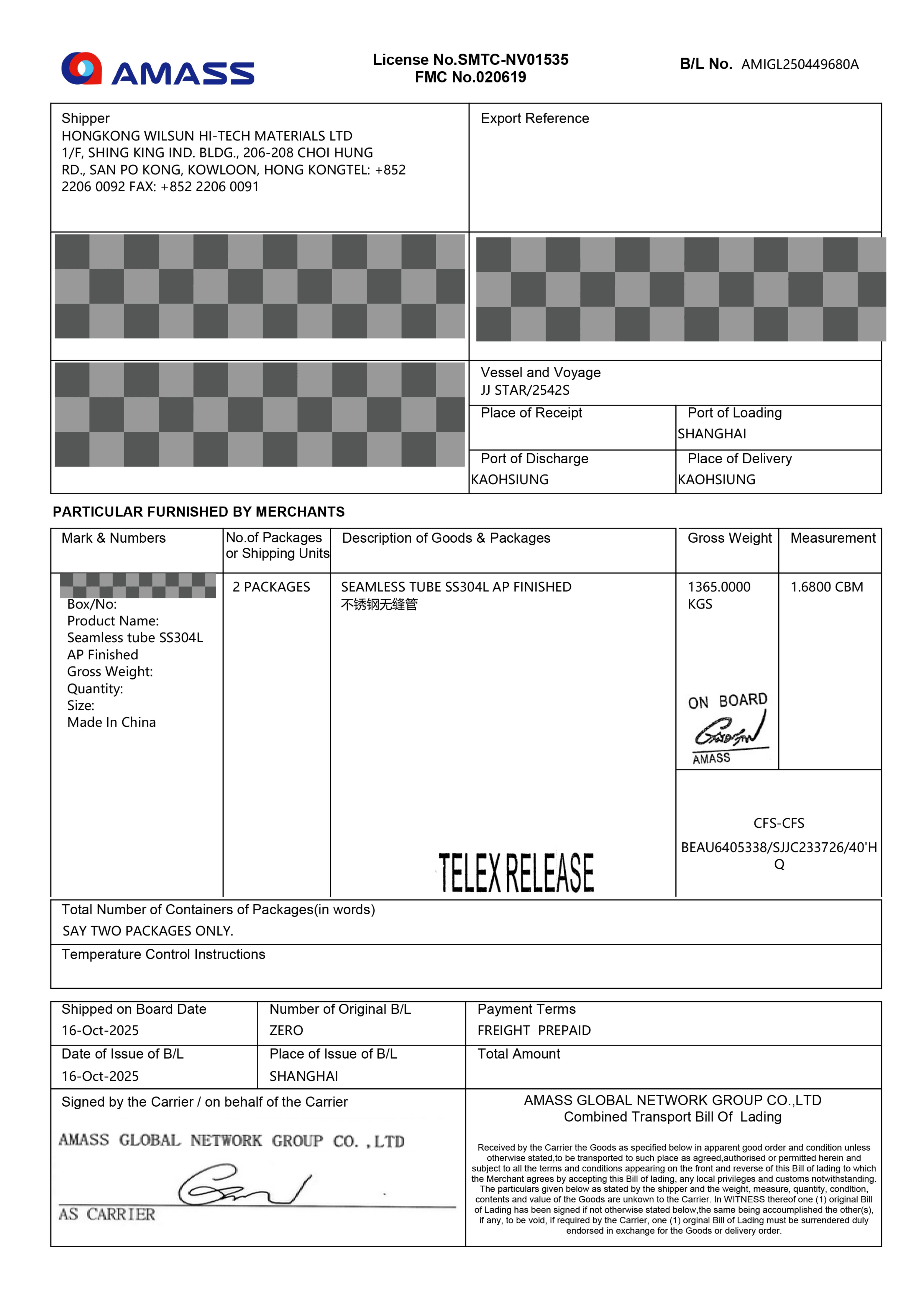 ,TAIWAN,SEA FREIGHT, SHIPMENT DATE:16-OCT.2025.